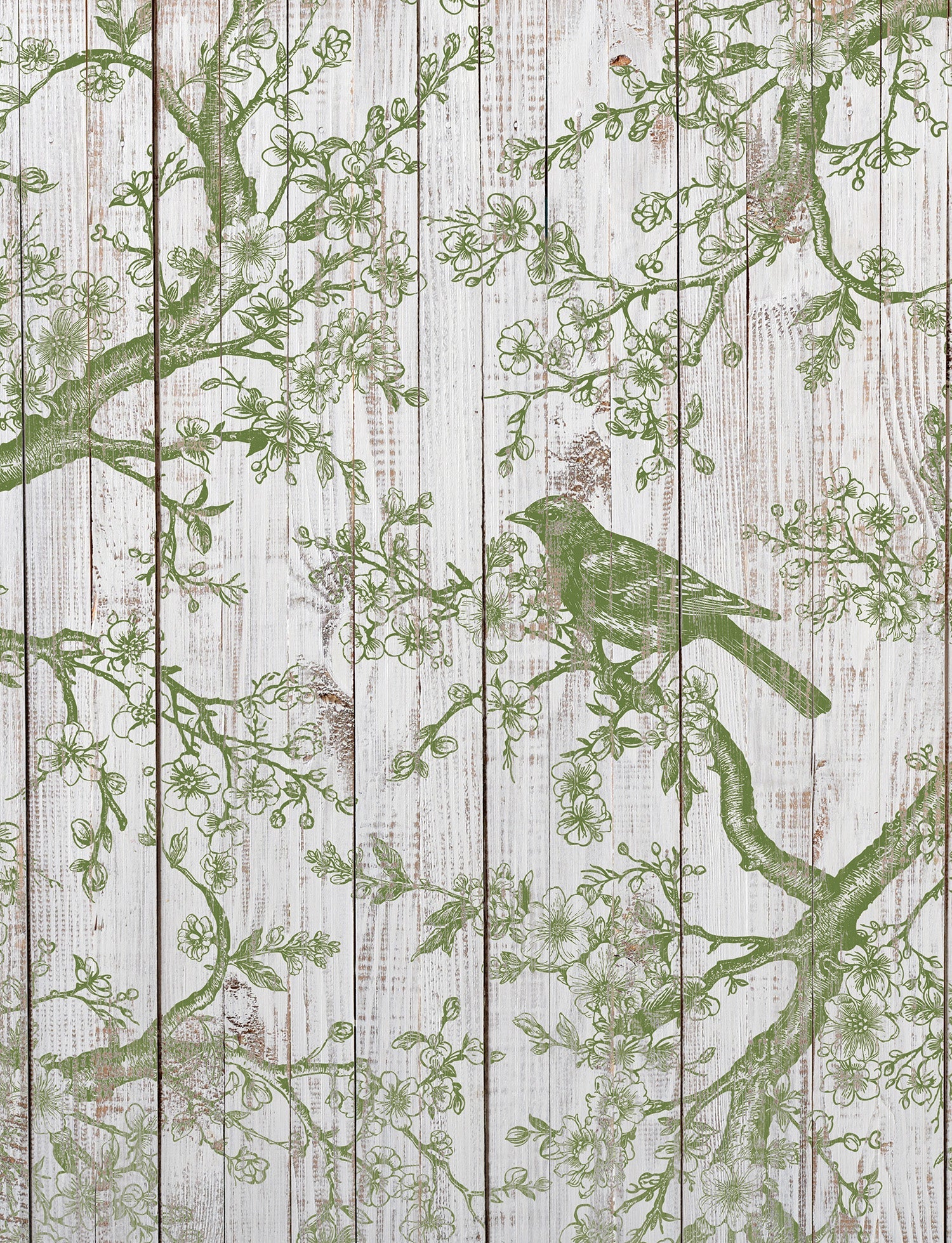 The abundant branches and cherry blossoms would be beautiful sprawling up on furniture like armoires and dressers. Create whimsical compositions on serving trays or mini-galleries with the sweet little birds tucked in the branches and florals.
